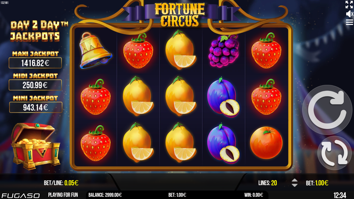 Fugaso, um jovem criador de produtos de jogos de casino online com jogos favorecidos pelos seus excelentes gráficos e um potencial de vitória bastante elevado, convida os jogadores do Frank Casino a experimentarem Fortune Circus, o seu novo título lançado há alguns dias. Apesar do seu nome, utiliza um tema clássico de fruta e não tem nada a ver com actos de circo. Contudo, ao contrário das slots clássicas, oferece um campo de jogo 5x3 e várias características adicionais que tornam a jogabilidade mais excitante e potencialmente lucrativa.